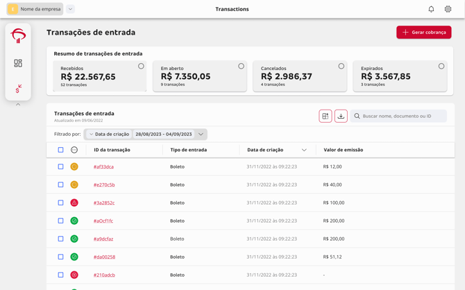 Cards de Resumo: Visualização rápida do que está Em aberto, Recebido, Vencido e Expirado.